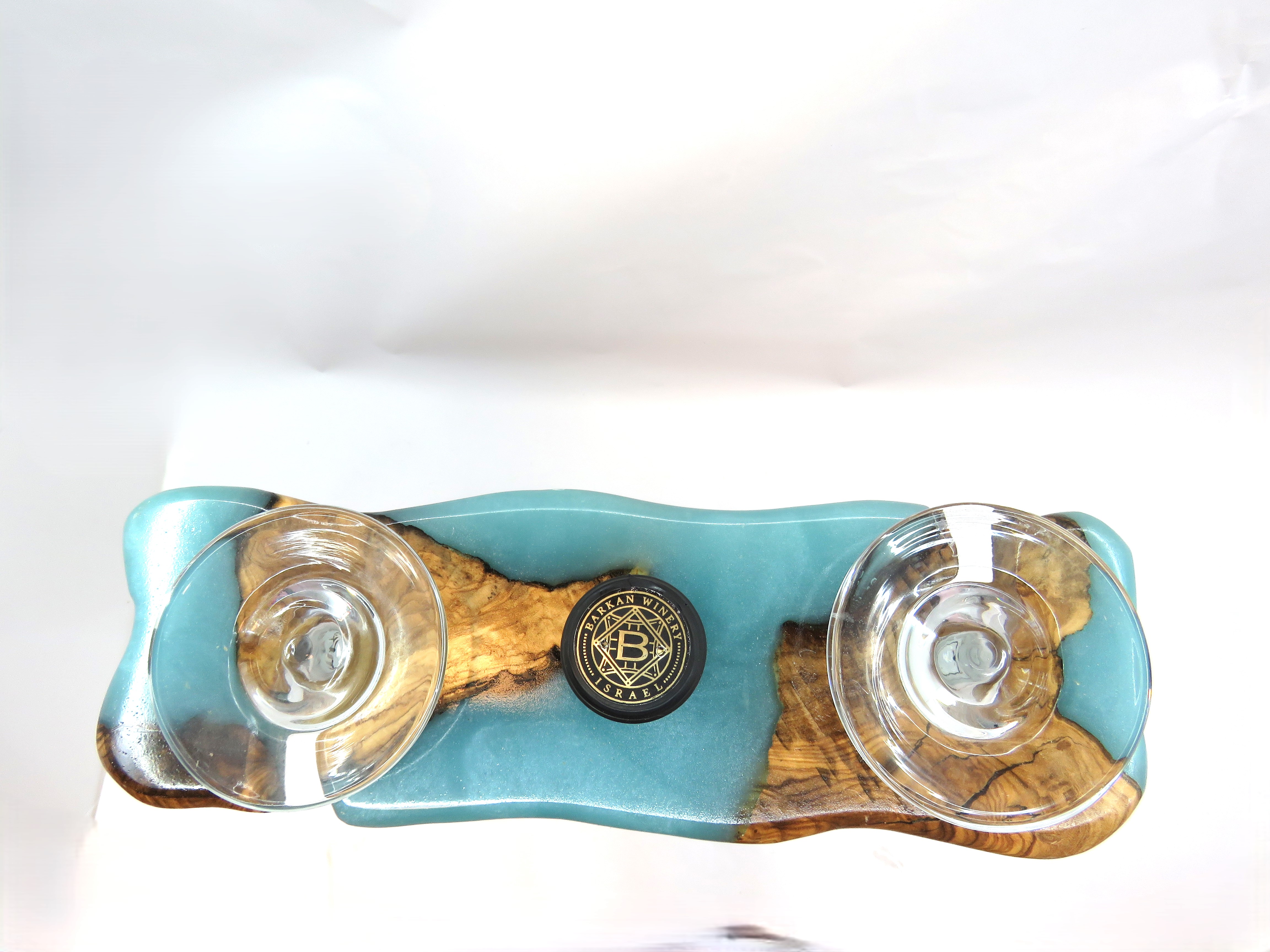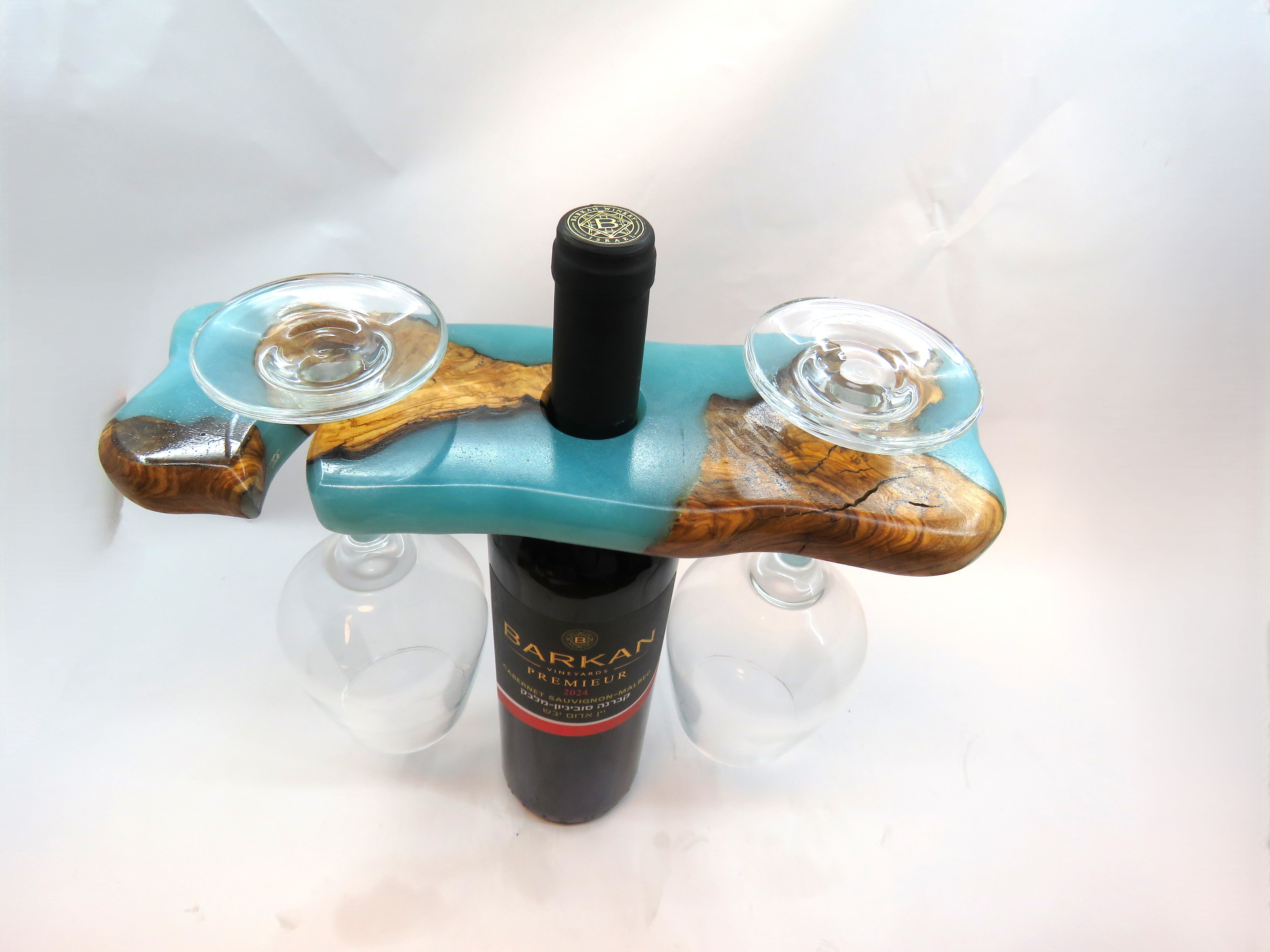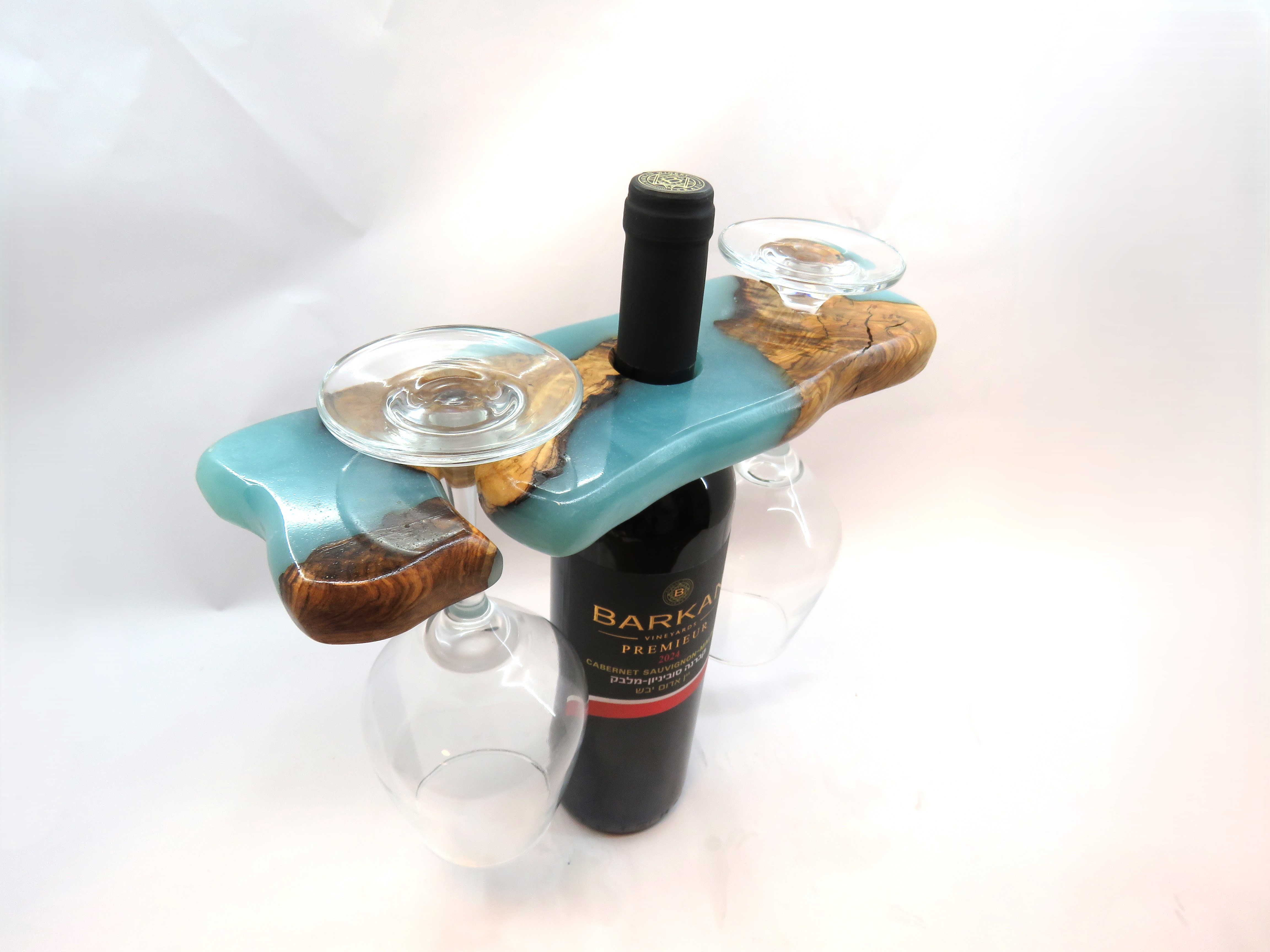 מעמד יין ייחודי העשוי מעץ זית טבעי בשילוב אפוקסי, עיצוב מקורי המציג את היופי הטבעי של העץ להעמדת בקבוק יין ושתי כוסות בדרך אלגנטית ומרשימה.