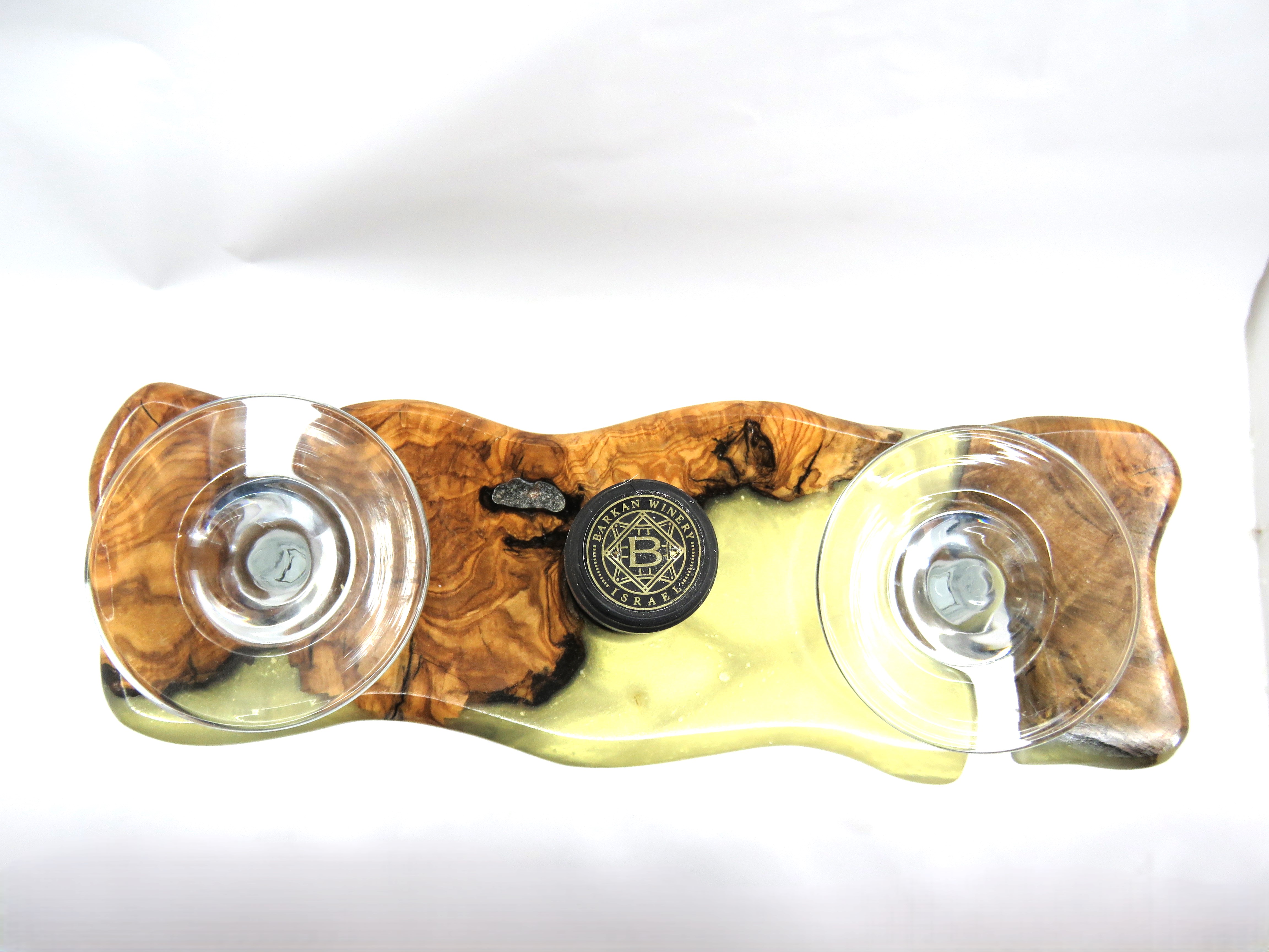 מעמד יין ייחודי העשוי מעץ זית טבעי בשילוב אפוקסי, עיצוב מקורי המציג את היופי הטבעי של העץ להעמדת בקבוק יין ושתי כוסות בדרך אלגנטית ומרשימה.